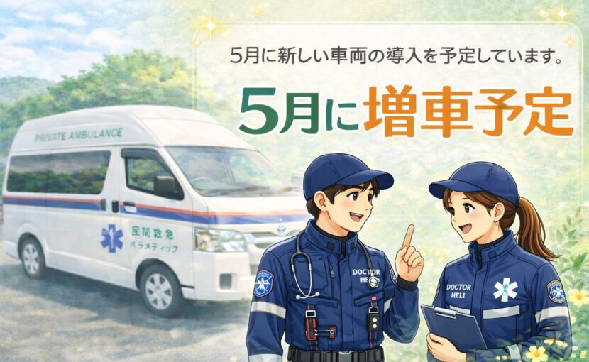 (株)民間救急パラメディックでは、より多くのご依頼にお応えできる体制づくりのため、5月に車両を1台増車予定です。